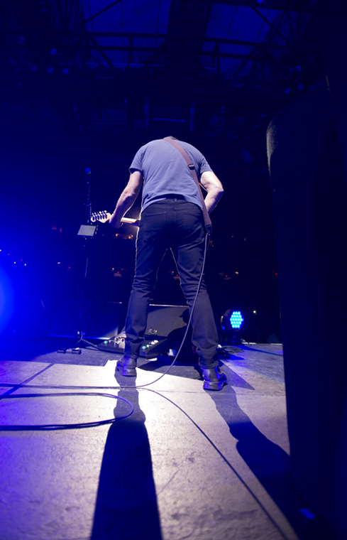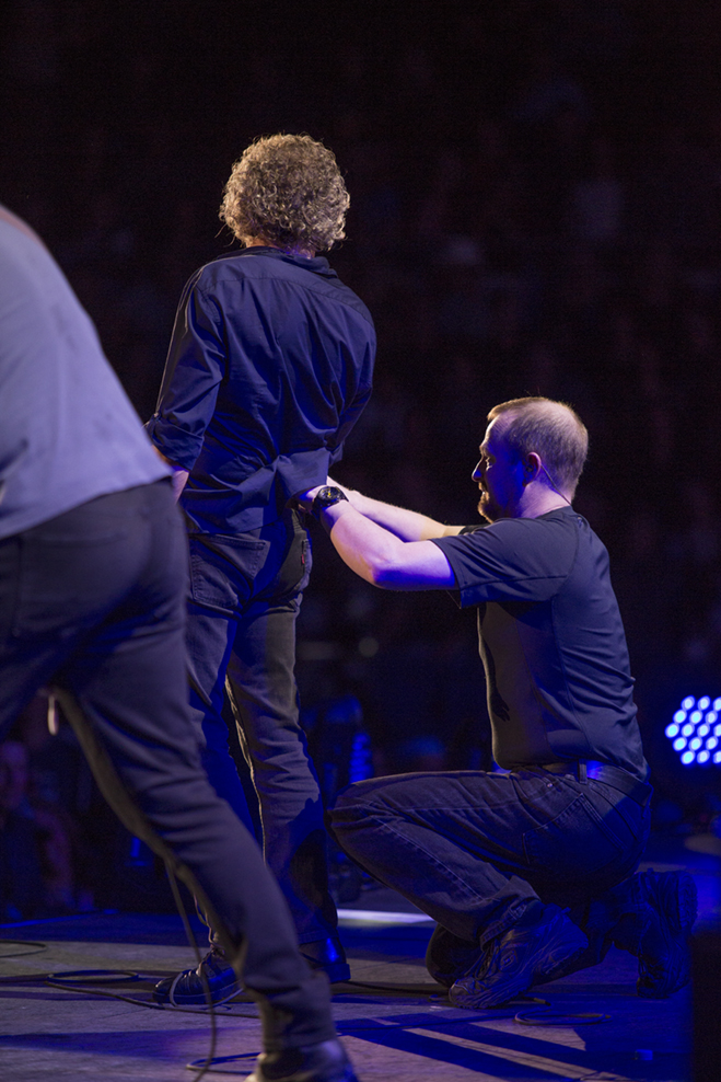 One portion of our crew deserves special mention: the Monitors. Monitors are an audio team, they control the sound that the band hears onstage. In a way, there’s is clearly the toughest job; the arrangement for microphones and connections to HEAR all the instruments. Then they send a mix of that sound back to each musician. In the old days, Bob Pridden (with The Who since 1966) ran a simple monitoring system. He’s still with us, running what Pete hears through four wedge speakers on the floor in front of Pete’s microphone. (Bob invented the wedge floor speakers around 1970 for Roger to hear his own singing onstage.) Pete’s the only band member without “ears” – which is what we call earbuds that the rest of the band use. If you ever see Roger fiddling with his “ears”, you’ll know he’s trying to re-seat them for better sound. It can REALLY affect your performance how the monitor mix sounds to you; how much drums you want to hear (anywhere on the stage), or bass or keyboards or yourself. Bob mixes Pete only, while Simon Higgs (Who monitor engineer for well over 15 years) is in charge of Roger and the multiple simultaneous mixes for each of the various band members. His is the large mixer just off to the right. Trevor Waite is our mobile monitor engineer, able to run across stage and work with Roger or the band during the show (Trevor is in a photo here adjusting Roger’s audio pack during the show). He helped save us on a one-time festival years ago and we stole him away for all The Who’s tours since. Both Simon and Trevor have the tough task dealing with the changing needs of a very dynamic band: the audience never hears a bit of what they’re doing, but it’s THE critical part of making the band have a good show. If you float any paper aeroplanes made of money in their direction, they will be received gently! And used on therapy, likely…