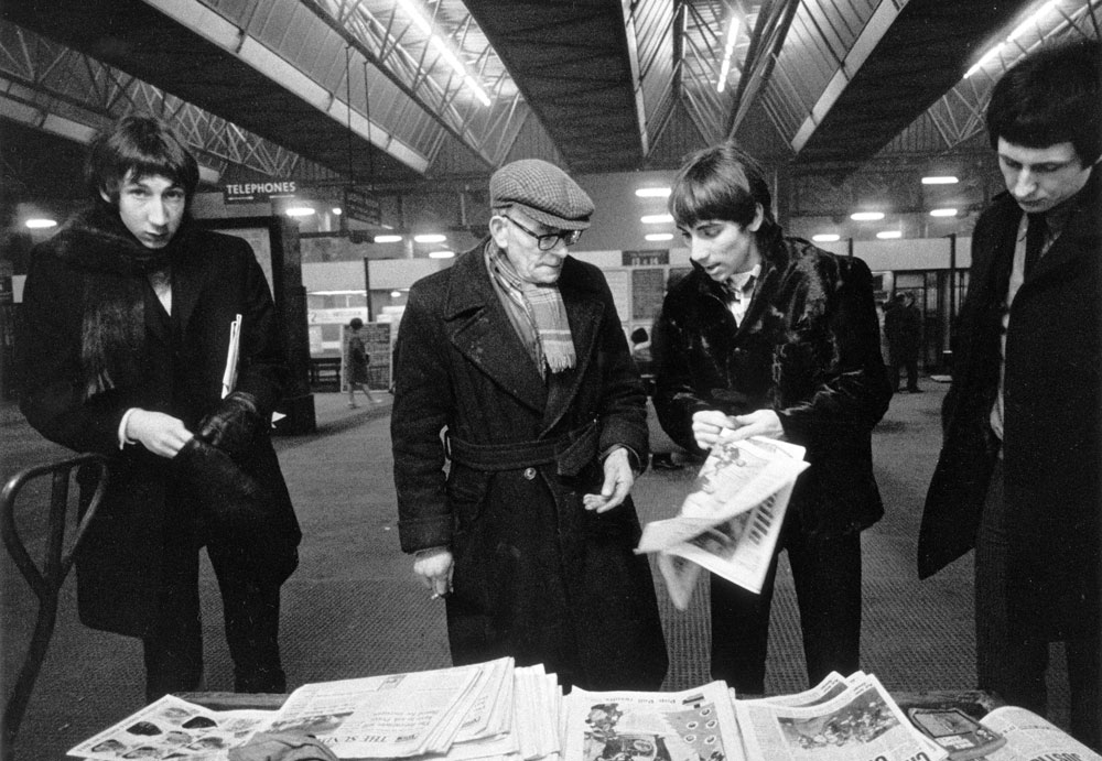 Pete, Keith and John buying newspapers at Manchester Piccadilly station, 23 January 1966