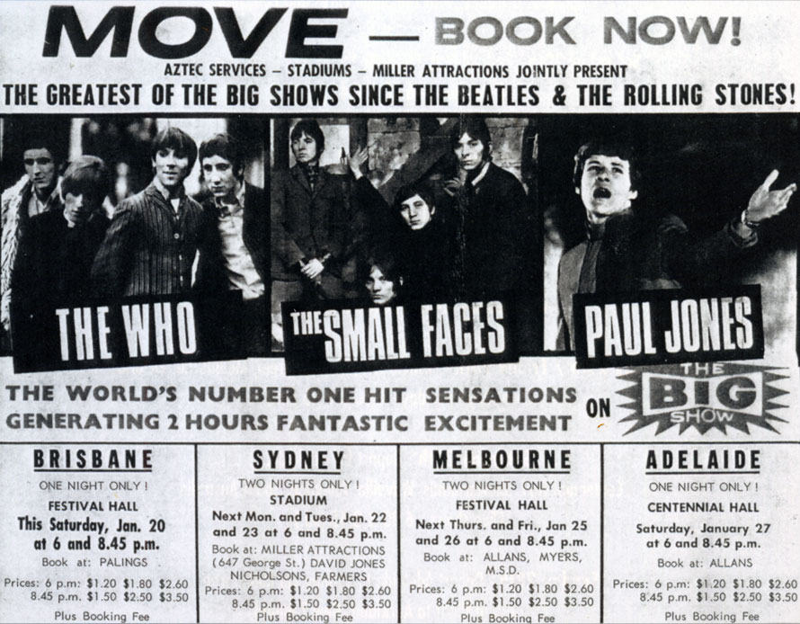 What followed was a ten-day tour of Australia and New Zealand with The Small Faces and Paul Jones – a tour beset by problems from grievous authorities, an unkindly press, overzealous police and hostile airline crews.