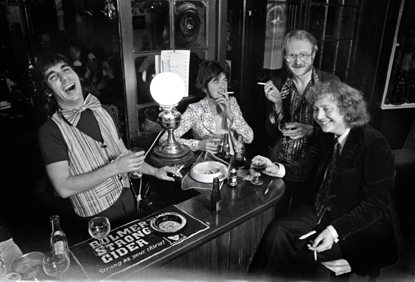 Here’s the bar of the Crown & Cushion with Keith pouring the drinks for Ronnie Lane, Vivian Stanshall and NME journalist Chris Welch. Photo by Barrie Wentzell for the NME.