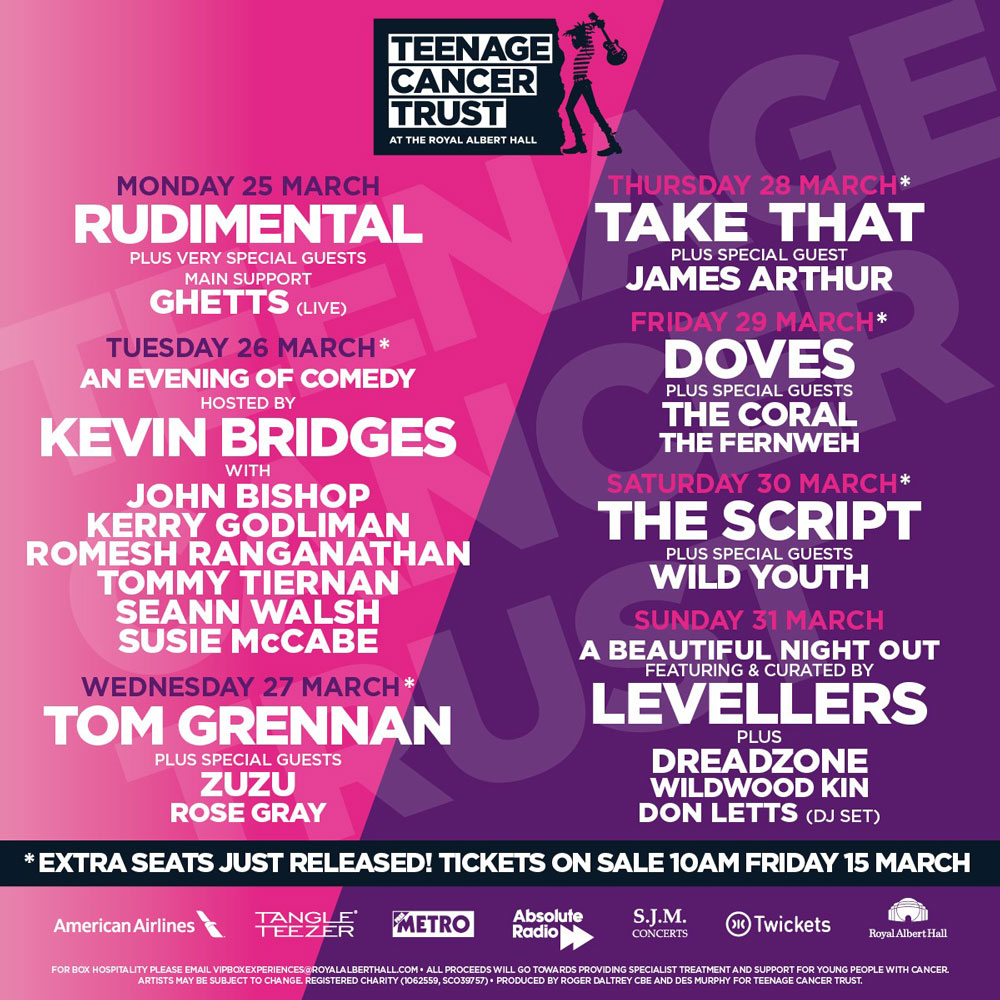 Here is this week’s incredible line-up and if you haven’t got tickets and would like to go to any of the shows we’ve included a ticket link for you. Have a great time during TCT week at the RAH and thank you so much for supporting such a great cause as the Teenage Cancer Trust. And remember, you can donate to TCT any time you want simply by clicking DONATE