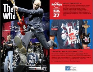 After legendary guitarist Pete Townshend donated his guitar to Hard Rock and helped to start the brand’s world-famous memorabilia collection, Rock and Roll Hall of Famers and Super Bowl XLIV halftime performers The Who are once again making Hard Rock history. Hard Rock International is proud to announce the limited-edition The Who Signature Series: Edition XXVII, designed by Pete Townshend and Roger Daltrey, which will benefit the City of Hope, a leading research, treatment and education center for cancer and other life-threatening illnesses. Fifteen percent of the retail sales from The Who Signature Series: Edition XXVII T-shirts and pins will be donated to City of Hope.