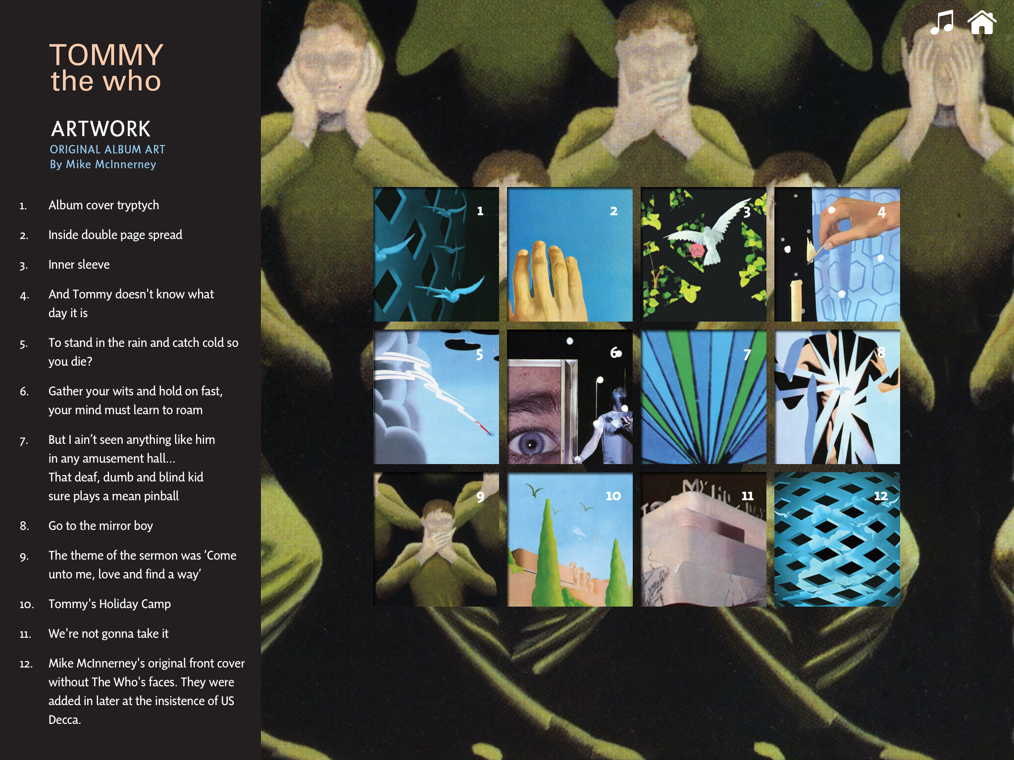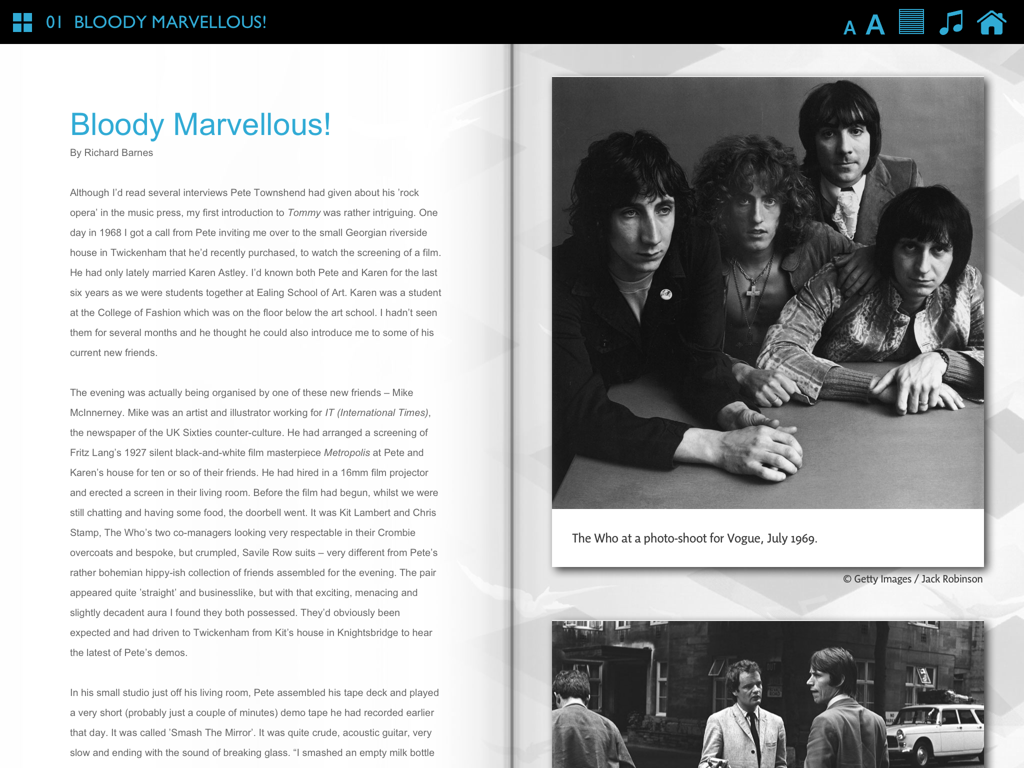 You can now download the app for free and, if you already have Tommy in your iTunes music collection, you can play the full tracks on your tablets along with the visuals/extra that accompany the super deluxe set. If not, you can play 90-second edited previews through iTunes & buy them directly. The critically acclaimed book written by Richard Barnes, Mike McInnerney’s original artwork & photos, included in the box, are available to flip through and view using the usual pinch & swipe navigation of the iPad. As with the music, the photos and the book are included in the ‘in-app’ purchase mechanic.